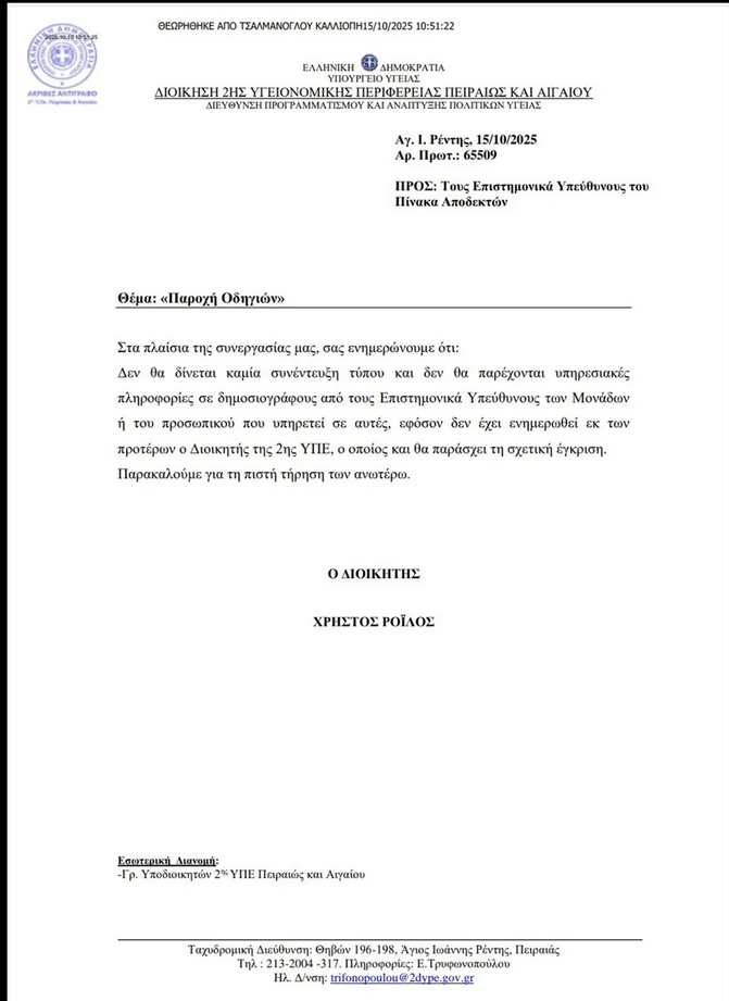 “Σχετικά με σημερινά δημοσιεύματα, τα οποία αφήνουν μομφές κατά της Διοίκησης της 2ης ΥΠΕ Πειραιώς και Αιγαίου ότι με έγγραφό της με τίτλο «Παροχή οδηγιών» επιχειρεί τον έλεγχο της «φωνής» των λειτουργών του ΕΣΥ, διευκρινίζονται τα εξής: