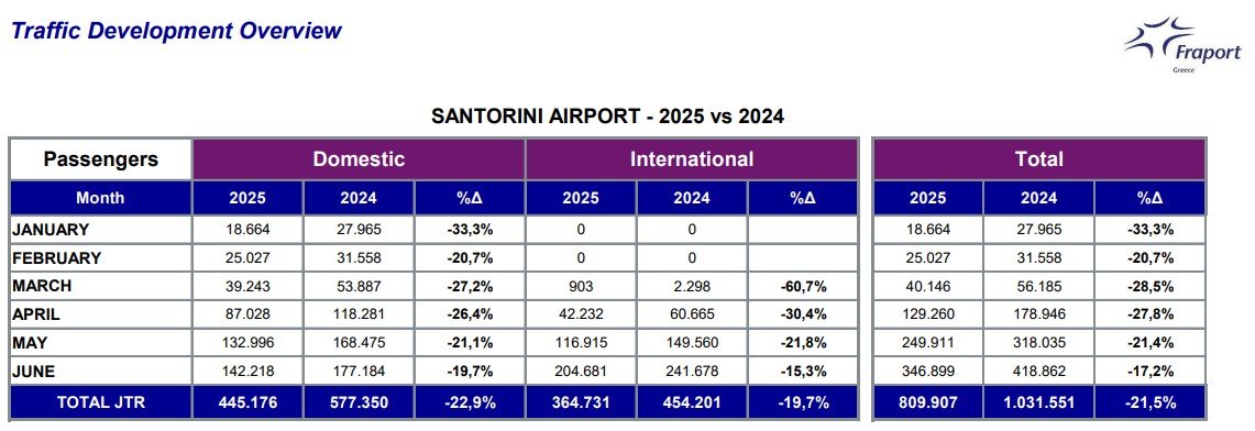Ο Αερολιμένας Σαντορίνης, υποδέχθηκε περίπου 72.000 λιγότερους επιβάτες σε σύγκριση με την ίδια περίοδο πέρυσι σημειώνοντας μείωση -17,2%. Ωστόσο υπάρχουν σημάδια σταδιακής ανάκαμψης καθώς η κίνηση βελτιώνεται δεδομένου ότι τον Απρίλιο η επιβατική κίνηση ήταν -27,8% και το Μάιο -21,4%.
