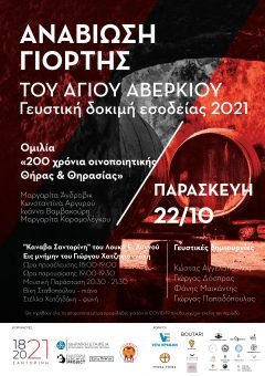 “Στο πλαίσιο του έτους «Σαντορίνη 1821-2021», η Θηραϊκή Εταιρεία Επιστημών, Γραμμάτων και Τεχνών, ο Δημοτικός Αθλητικός Πολιτιστικός Περιβαλλοντικός Οργανισμός Σαντορίνης (ΔΑΠΠΟΣ), το Ψηφιακό Αρχείο Θήρας (Santorini Archive Project) και η Εστία Πύργου Καλλίστης, σας προσκαλούν στην εκδήλωση για την αναβίωση του εθίμου του Αγίου Αβερκίου, στην ποτοποιία «Κάναβα Σαντορίνη» του Λουκά Ε. Λυγνού στη Μεσαριά, την Παρασκευή 22 Οκτωβρίου και ώρα 18:00μμ.
