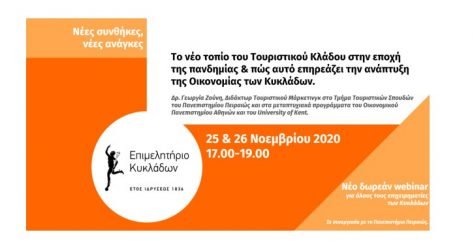 Το Επιμελητήριο Κυκλάδων ενημερώνει κάθε ενδιαφερόμενο ότι άλλαξε η ώρα διεξαγωγής του προγραμματισμένου για την Τετάρτη 25 και Πέμπτη 26 Νοεμβρίου 2020 webinar με θέμα «Το νέο τοπίο του Τουριστικού Κλάδου, με τα έως σήμερα δεδομένα, στην εποχή της πανδημίας και πώς αυτό επηρεάζει την ανάπτυξη της Οικονομίας των Κυκλάδων».