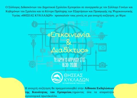 Στην προσπάθεια προσέγγισης αυτού του μεγάλου ζητήματος ο Σύλλογος Διδασκόντων του Δημοτικού Σχολείου Εμπορείου σε συνεργασία με το Σύλλογο Γονέων και Κηδεμόνων του Σχολείου και το Κέντρο Πρόληψης Εξαρτήσεων και Προαγωγής Ψυχοκινητικής Υγείας “ΘΗΣΕΑΣ ΚΥΚΛΑΔΩΝ” διοργανώνουν ανοικτή συζήτηση με θέμα “Επικοινωνία & Διαδίκτυο”.