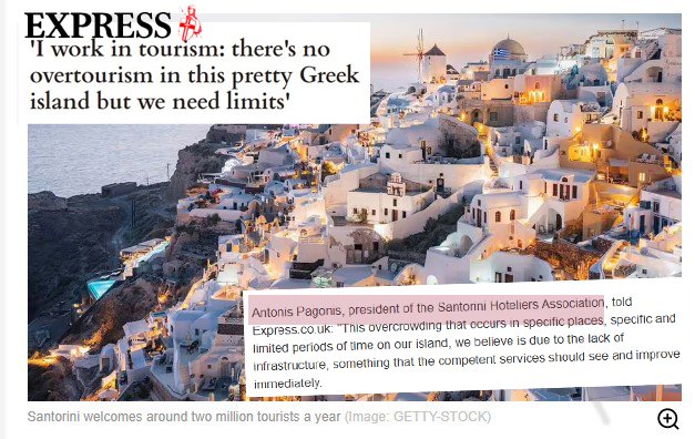 “Δεν υπάρχει υπερτουρισμός στη Σαντορίνη αλλά χρειαζόμαστε όρια» ανέφερε απαντώντας σε ερωτήσεις της δημοσιογράφου Alice Scarsi της εφημερίδας express.co.uk, ο πρόεδρος της Ένωσης ξενοδόχων Σαντορίνης Αντώνης Παγώνης.