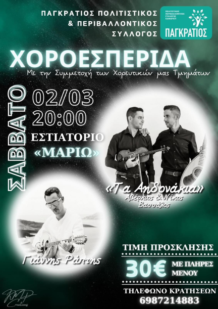 Στην Χοροεσπερίδα μας θα απολαύσετε τα «Αηδονάκια» Αβέρκιο & Νίκο Βασσάλο και τον Γιάννη Ράπτη, αλλά και το Χορευτικό Σχήμα Ενήλικων του Παγκράτιου Συλλόγου το οποίο θα εμπλουτίσει τη βραδιά μας με Καμαριανή Καντάδα και Χορό”.