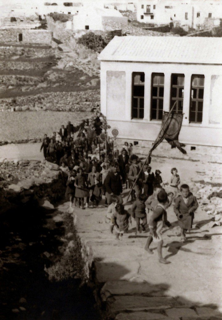 Είναι μία από τις λίγες φωτογραφίες που φαίνεται η μία κλίση της κεραμοσκεπής με τα Βυζαντινά κεραμίδια του Νεοκλασικού διτάξιου διδακτηρίου Σικίνου, που κτίστηκε το 1901, δωρεά Ανδρέα Συγγρού, στην κεφαλή της πομπής παιδιά κουρεμένα με την ψιλή, ξυπόλητα και με φτωχικά μεταποιημένα ρούχα γιατί ήταν τα χρόνια που η Ελλάδα και η Σίκινος προσπαθούσε να ορθοποδήσει από έναν καταστροφικό παγκόσμιο πόλεμο και από ένα εμφύλιο σπαραγμό.