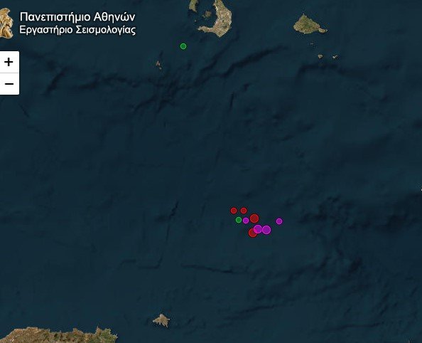 Σμήνος σεισμικών δονήσεων μικρής έντασης καταγράφηκε τα ξημερώματα στο θαλάσσιο χώρο μεταξύ Ηρακλείου Κρήτης και Σαντορίνης. Σύμφωνα με το Εργαστήριο Γεωφυσικής του Πανεπιστημίου Αθηνών, η τελευταία δόνηση σημειώθηκε στις 4:24 ώρα Γκρίνουιτς (7:24 ώρα Ελλάδας) και είχε μέγεθος 4,3 βαθμών της κλίμακας Ρίχτερ.