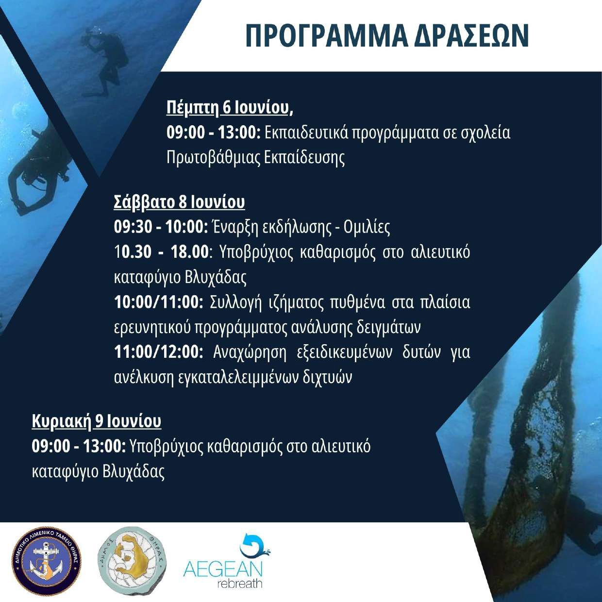 Το Δημοτικό Λιμενικό Ταμείο Θήρας, σε συνεργασία με την Aegean Rebreath, το Δήμο Θήρας και ομάδα 28 περίπου εθελοντών, θα βρίσκονται στο αλιευτικό καταφύγιο της Βλυχάδας για τις ετήσιες, διευρυμένες περιβαλλοντικές δράσεις προστασίας του θαλάσσιου περιβάλλοντος. Συγκεκριμένα, το Σάββατο 8 Ιουνίου από τις 09:30 έως τις 18:00 και την Κυριακή 9 Ιουνίου από τις 09:00 έως τη 13:00, θα πραγματοποιηθούν υποβρύχιοι εθελοντικοί καθαρισμοί στο αλιευτικό καταφύγιο της Βλυχάδας και εκτενής χαρτογράφηση και εντοπισμός επιβαρυμένων ζωνών της περιοχής.