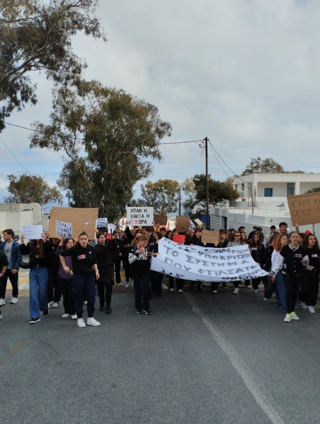 Η παρουσία των μαθητών του νησιού, η μαχητικότητά τους, τα συνθήματά τους ήταν αυτά που έδωσαν τον τόνο στη σημερινή πολύ ελπιδοφόρα απεργιακή κινητοποίηση που κατέληξε στο Δημαρχείο, όπου δόθηκε υπόσχεση για συνέχεια”.