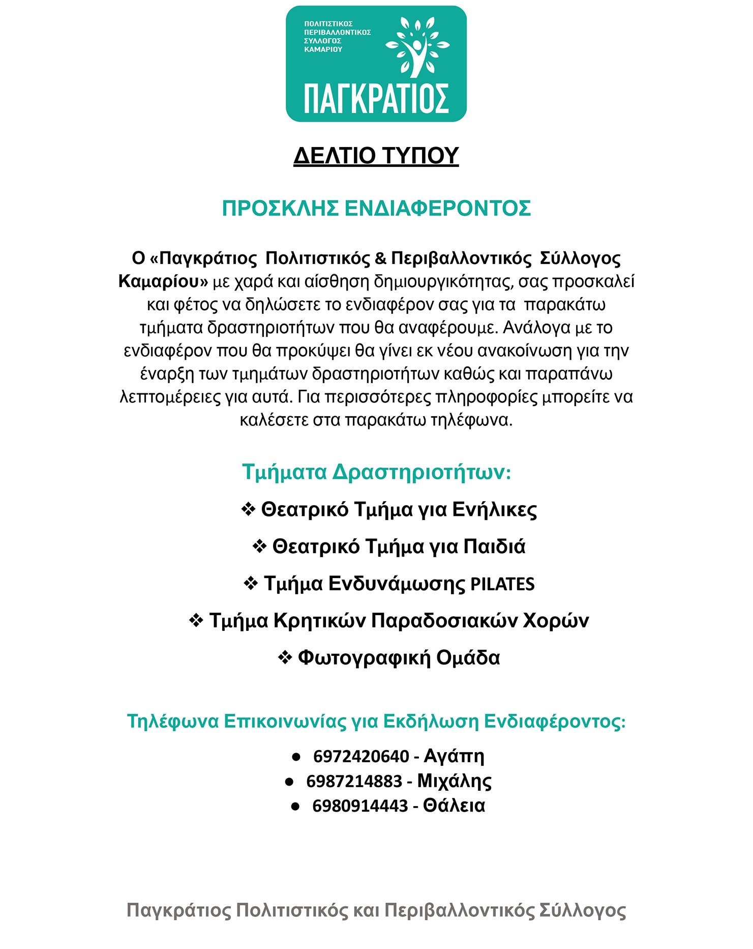 Εγγραφές στα καλλιτεχνικά τμήματα του “Παγκράτιου”