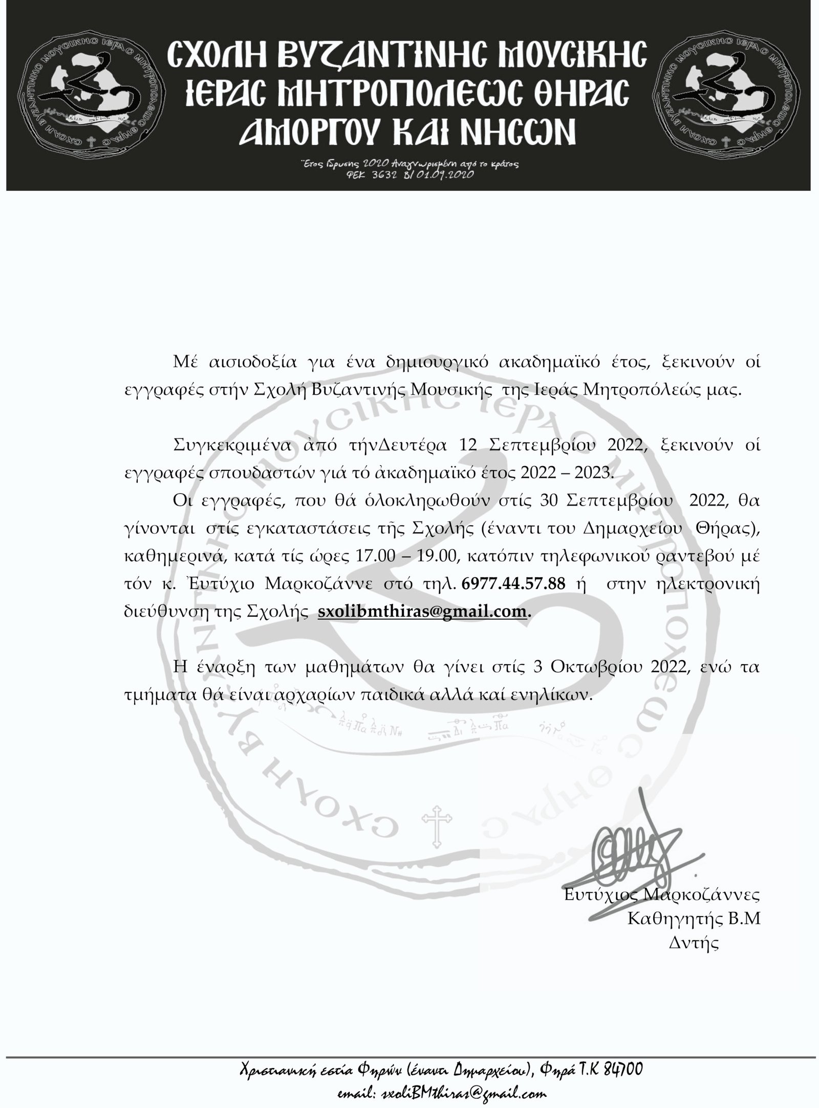 ΕΓΓΡΑΦΕΣ ΣΤΗ ΣΧΟΛΗ ΒΥΖΑΝΤΙΝΗΣ ΜΟΥΣΙΚΗΣ