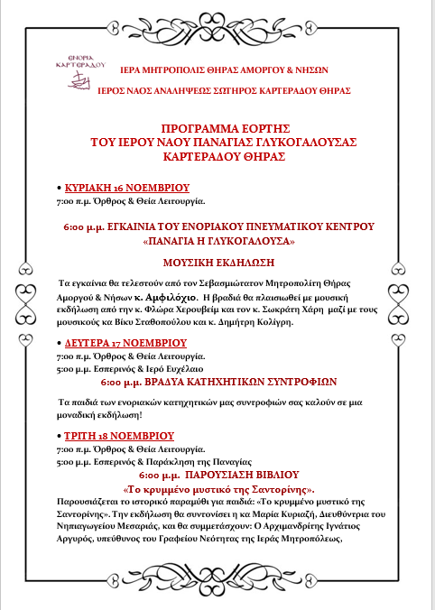 Με ιδιαίτερη χαρά σας προσκαλούμε στα εγκαίνια του Ενοριακού Πνευματικού Κέντρου «Η Γλυκογαλούσα», που βρίσκεται δίπλα από τον Ιερό Ναό Γλυκογαλούσας στον Καρτεράδο Θήρας.