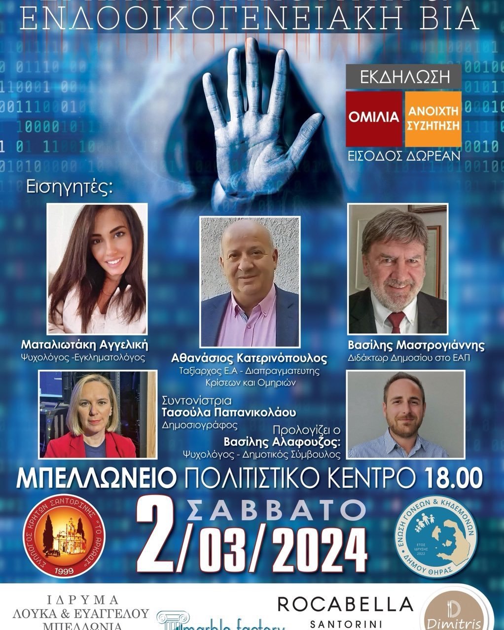 Εκδήλωση – ανοιχτή συζήτηση με θέμα “Εγκληματικότητα και ενδοοικογενειακή βία συμπεριλαμβανομένου του ενδοσχολικού εκφοβισμού” στις 2 Μαρτίου 2024 και ώρα 18.00 στο Μπελλώνειο Πολιτιστικό Κέντρο στα Φηρά συνδιοργανώνουν η Ένωση Γονέων Θήρας και ο Πολιτιστικός Σύλλογος Κρητών “Το Αρκάδι”, με ομιλητές ειδικούς στο αντικείμενο επιστήμονες.