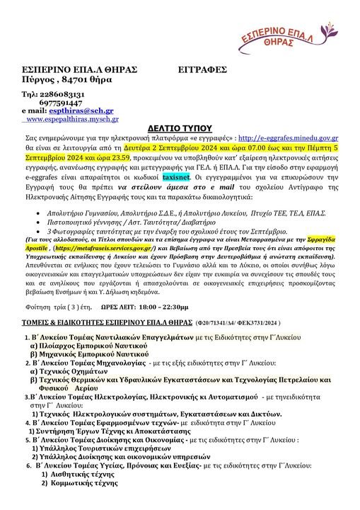“Σας ενημερώνουμε για την ηλεκτρονική πλατφόρμα «e εγγραφές»: https://e-eggrafes.minedu.gov.gr θα είναι σε λειτουργία από τη Δευτέρα 2 Σεπτεμβρίου 2024 και ώρα 07.00 έως και την Πέμπτη 5 Σεπτεμβρίου 2024 και ώρα 23.!?..2π,ροκειμένου να υποβληθούν κατ’ εξαίρεση ηλεκτρονικές αιτήσεις εγγραφής, ανανέωσης εγγραφής και μετεγγραφής για ΓΕ.Λ. ή ΕΠΑ.Λ. Για την είσοδο στην εφαρμογή e-eggrafes είναι απαραίτητοι οι κωδικοί Τaxisnet. Οι εγγεγραμμένοι για να επικυρώσουν την Εγγραφή τους θα πρέπει να στείλουν άμεσα στο e mail του σχολείου Αντίγραφο της Ηλεκτρονικής Αίτησης Εγγραφής τους και τα παρακάτω δικαιολογητικά: