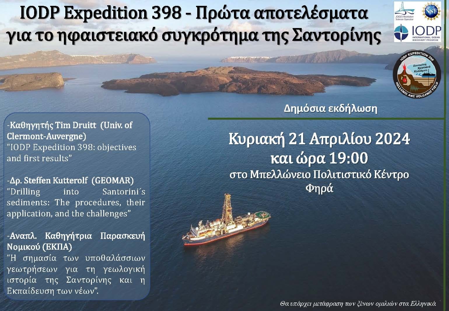 “Εκ μέρους της επιστημονικής ομάδας της Διεθνούς ερευνητικής αποστολής των υποθαλάσσιων ερευνητικών γεωτρήσεων «IODP Expedition 398» σας προσκαλούμε να συμμετέχετε στη δημόσια εκδήλωση “IODP Expedition 398 – Πρώτα αποτελέσματα για το ηφαιστειακό συγκρότημα της Σαντορίνης” η οποία θα πραγματοποιηθεί την Κυριακή 21 Απριλίου 2024 στο Μπελλώνειο Πολιτιστικό Κέντρο (Φηρά) στις 19:00.Πρόγραμμα Ομιλιών: