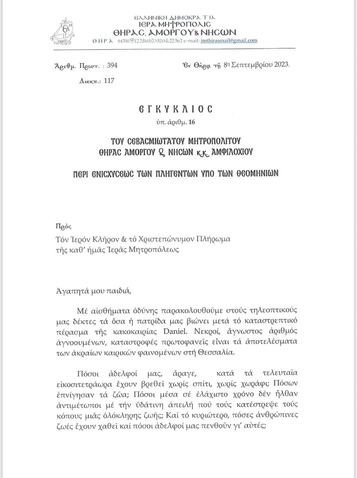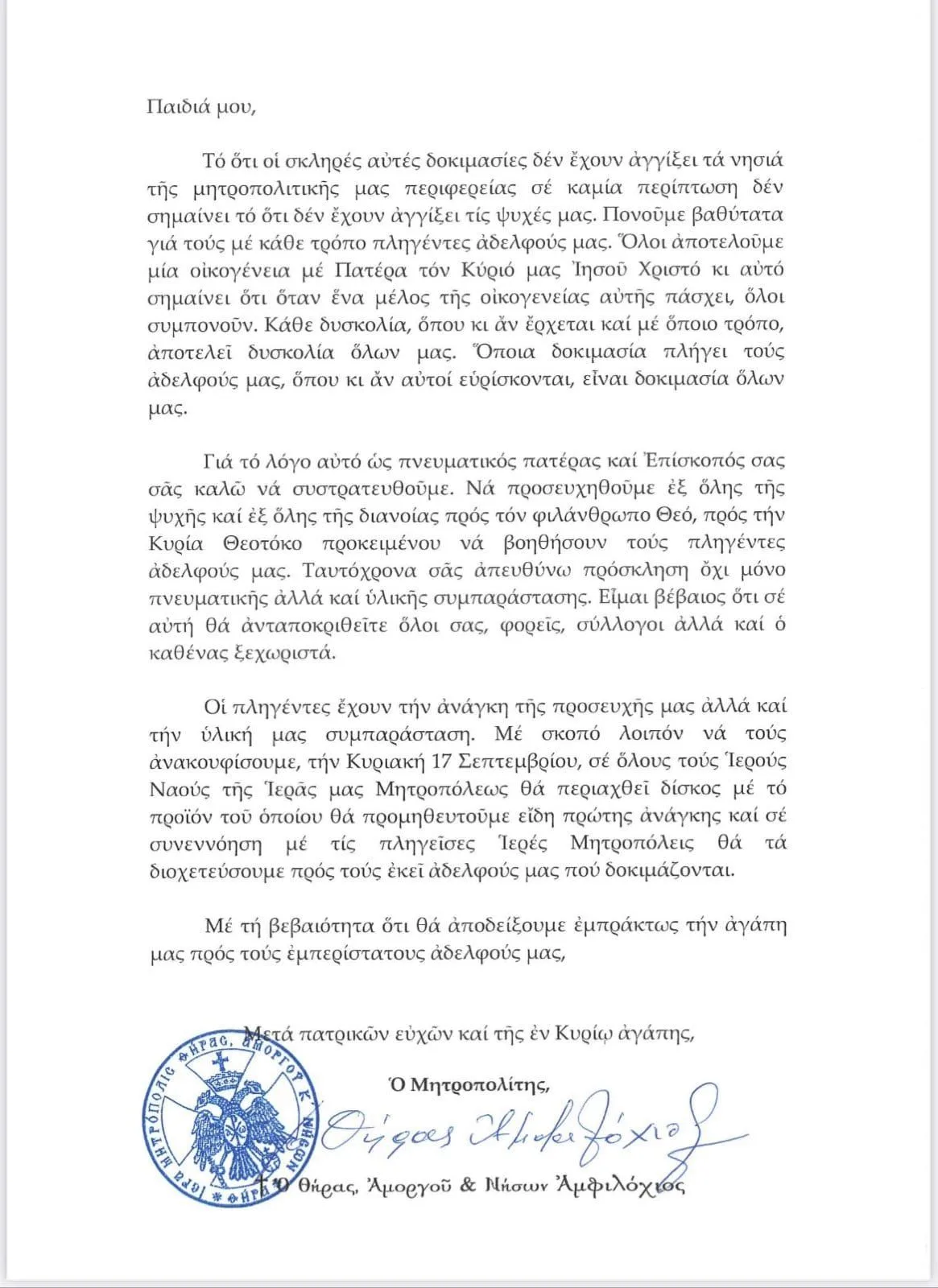 Εγκύκλιος του Μητροπολίτη