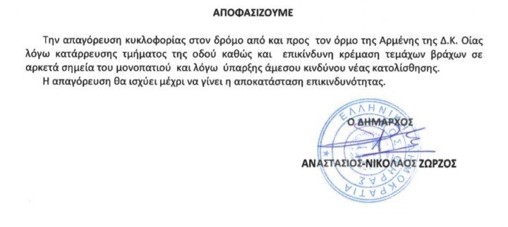 ΕΚΛΕΙΣΕ ME ΑΠΟΦΑΣΗ ΔΗΜΑΡΧΟΥ Ο ΔΡΟΜΟΣ ΑΡΜΕΝΗΣ