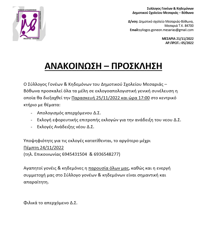 ΕΚΛΟΓΕΣ-ΣΥΛΛΟΓΟΣ ΓΟΝΕΩΝ ΚΑΙ ΚΗΔΕΜΟΝΩΝ ΔΗΜ. ΣΧ. ΜΕΣΣΑΡΙΑΣ – ΒΟΘΩΝΑ