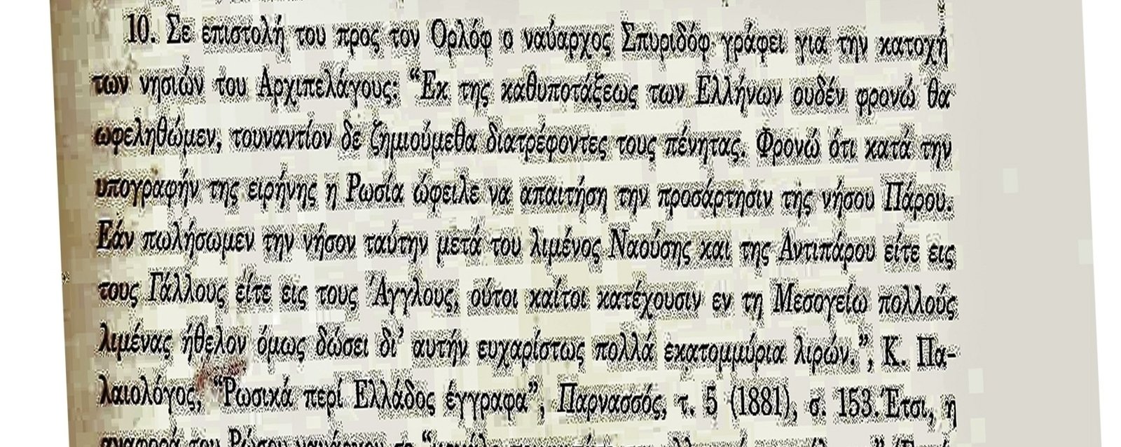 Το δεύτερο χαρμόσυνο, είναι πως αυτή η συστηματική δουλειά, αναφέρεται σε μια ελάχιστα γνωστή περίοδο της ιστορίας των Κυκλάδων. Τότε που η Τσαρική Ρωσία (Μεγάλη Αικατερίνη, η τσαρίνα) με τους Αδελφούς Ορλώφ, κατέλαβε για τέσσερα χρόνια τις Κυκλάδες, εγκαθιδρύοντας ένα ιδιότυπο προτεκτοράτο. Και για να μη μείνει καμία αμφιβολία στους ρομαντικούς, σε εκείνους που προσδοκούν πως το ξανθό γένος θα μας σώσει και πως οι θρησκευτικοί δεσμοί Ελλάδας Ρωσίας, αποτελούν έναν ακατάλυτο δεσμό, αρκεί μια παραπομπή της ερευνήτριας -συγγραφέως στη σελίδα 15 για να δώσει στον δέοντα βαθμό τον κυνισμό των μεγάλων. Το παραθέτω σε σάρωση από το ίδιο το βιβλίο: