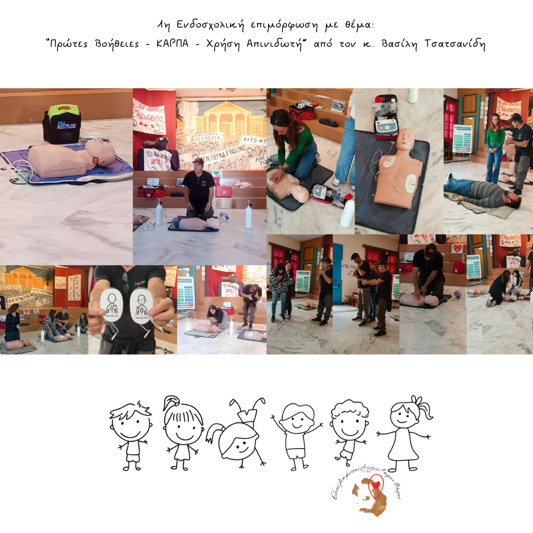 “Τη Δευτέρα 17/11/2025 μετά τη γιορτή της 52ης επετείου του Πολυτεχνείου και την αποχώρηση των μικρών μας μαθητών/τριών από το σχολείο, πραγματοποιήθηκε η 1η Ενδοσχολική Επιμόρφωση διάρκειας τριών (3) ωρών με θέμα τις Πρώτες βοήθειες -ΚΑΡΠΑ- Χρήση Απινιδωτή από τον κ. Βασίλη Τσατσανίδη.