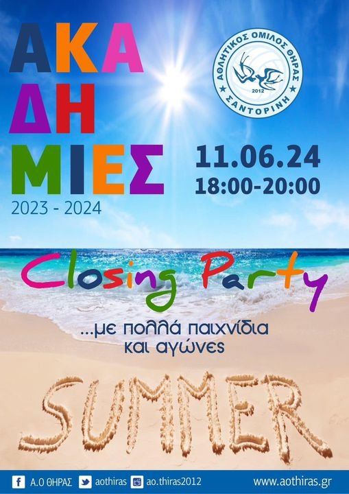 “Την Τρίτη 11 Ιουνίου 18.00 με 20.00 στο κλειστό γυμναστήριο θα πραγματοποιήσουμε το closing party των ακαδημιών μας, ώστε η φετινή επιτυχημένη αθλητική χρονιά να ολοκληρωθεί για τις νεαρές αθλήτριες των τμημάτων μας με πολλά παιχνίδια, χαμόγελα και χαρά!