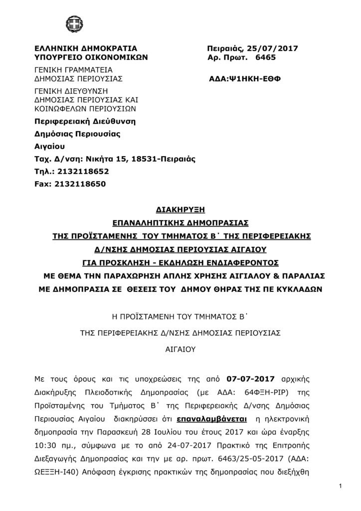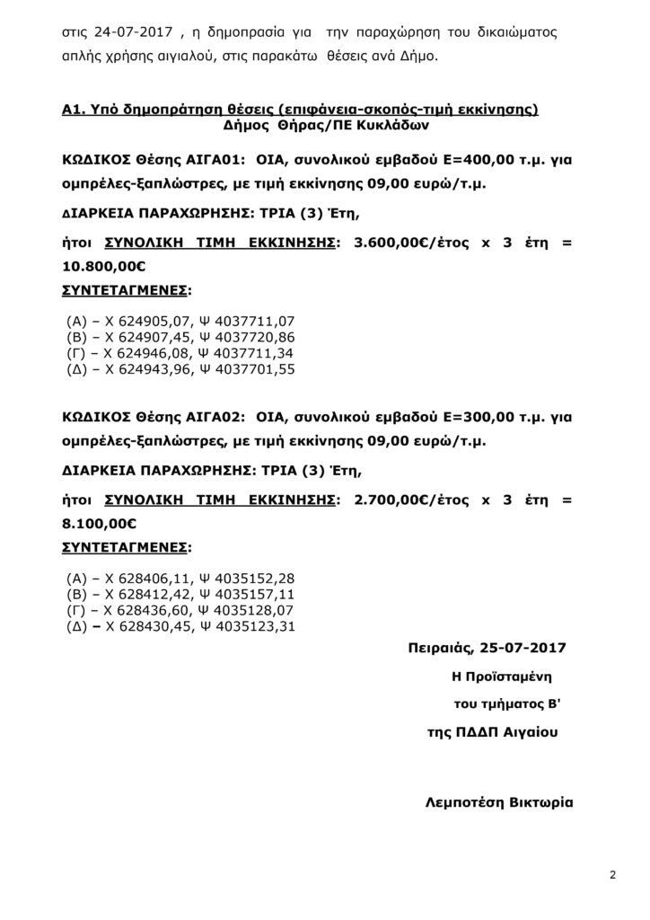 Επανάληψη της ηλεκτρονικής δημοπρασίας για την παραχώρηση του δικαιώματος απλής χρήσης αιγιαλού (τοποθέτηση ομπρελών) σε δύο (2) τμήματα ακτών της Θήρας.