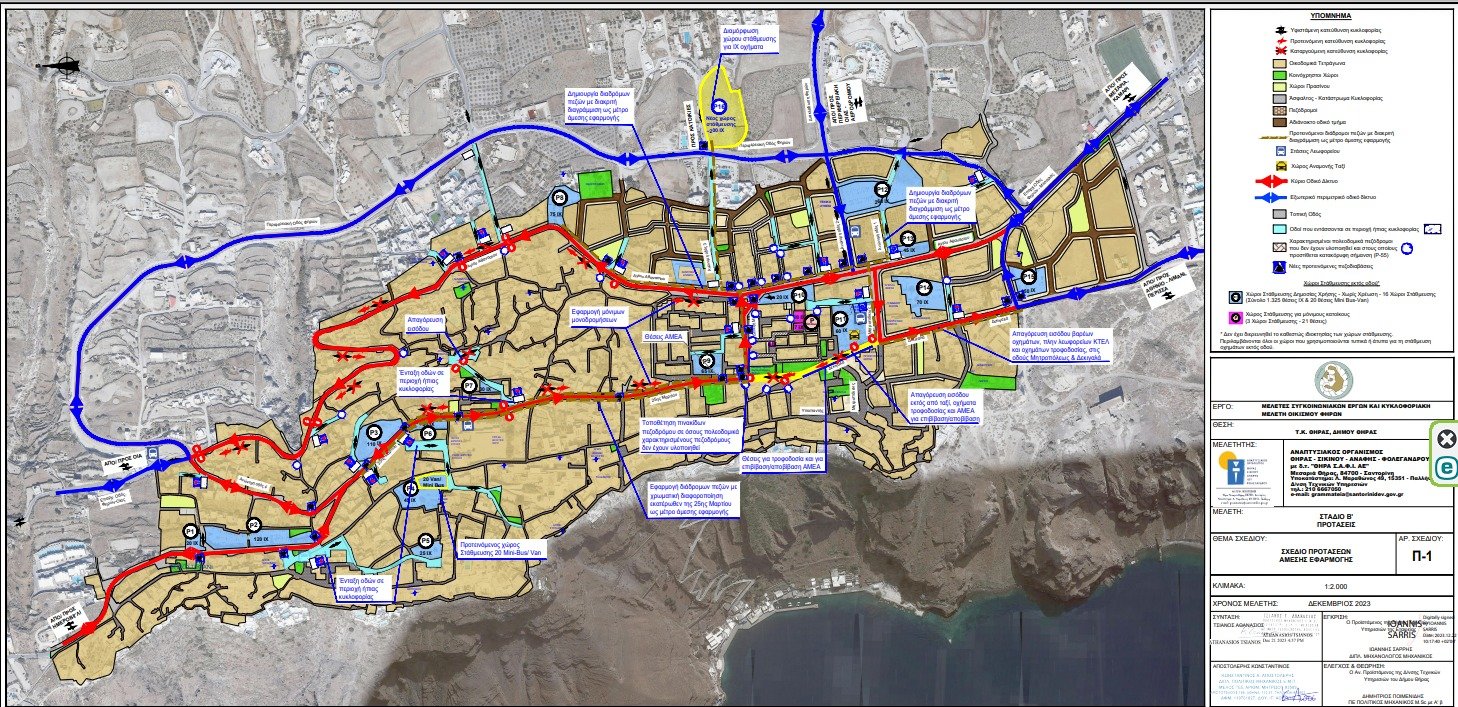 • Μονοδρόμηση της οδού η οποία διέρχεται έμπροσθεν του Γενικού Λυκείου Θήρας μεταξύ της οδού Αγ. Αθανασίου και της Περιφερειακής οδού των Φηρών με κατεύθυνση προς την οδό Αγ. Αθανασίου.