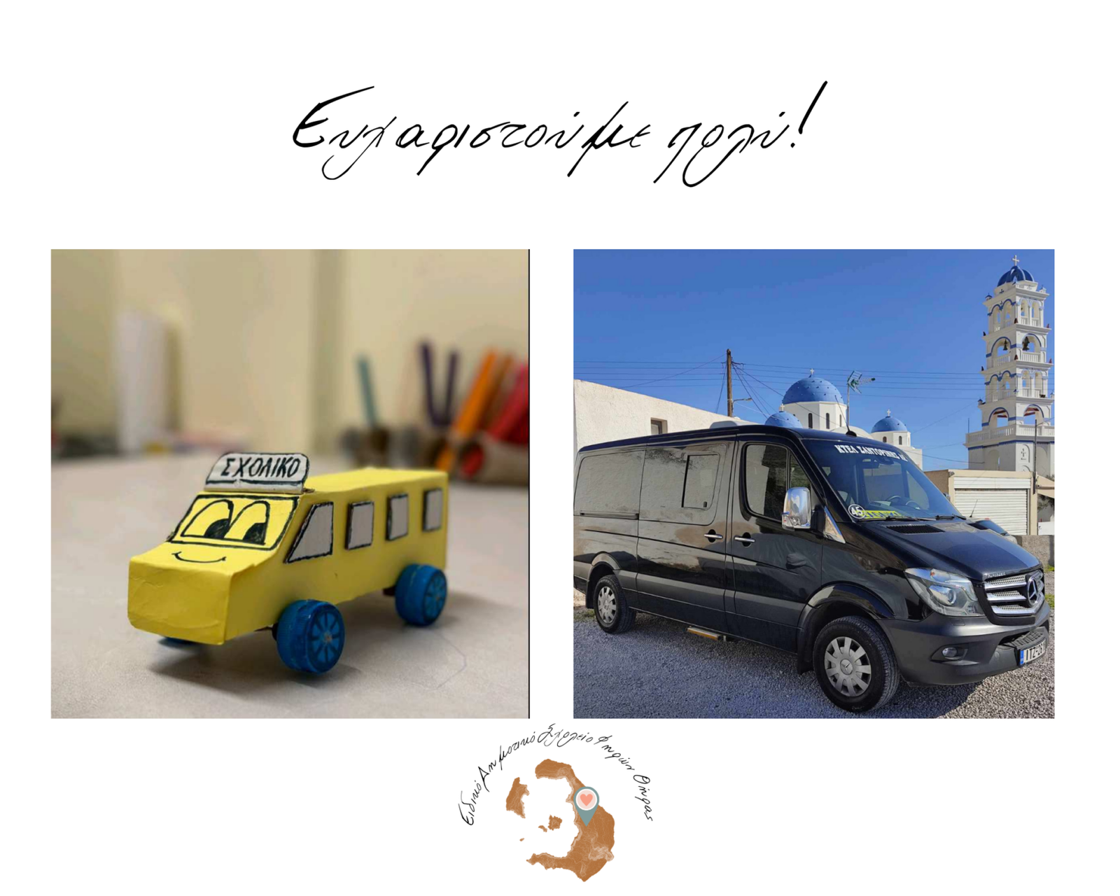 Στην αφίσα αριστερά είναι η κατασκευή – δημιουργία του σχολικού λεωφορείου από τους μαθητές/τριες στο Τμήμα Εργοθεραπείας του σχολείου μας και δεξιά το σχολικό λεωφορείο που εξυπηρετεί τους μαθητές/τριες των Σχολικών Μονάδων Ειδικής Αγωγής & Εκπαίδευσης του Δήμου Θήρας”.