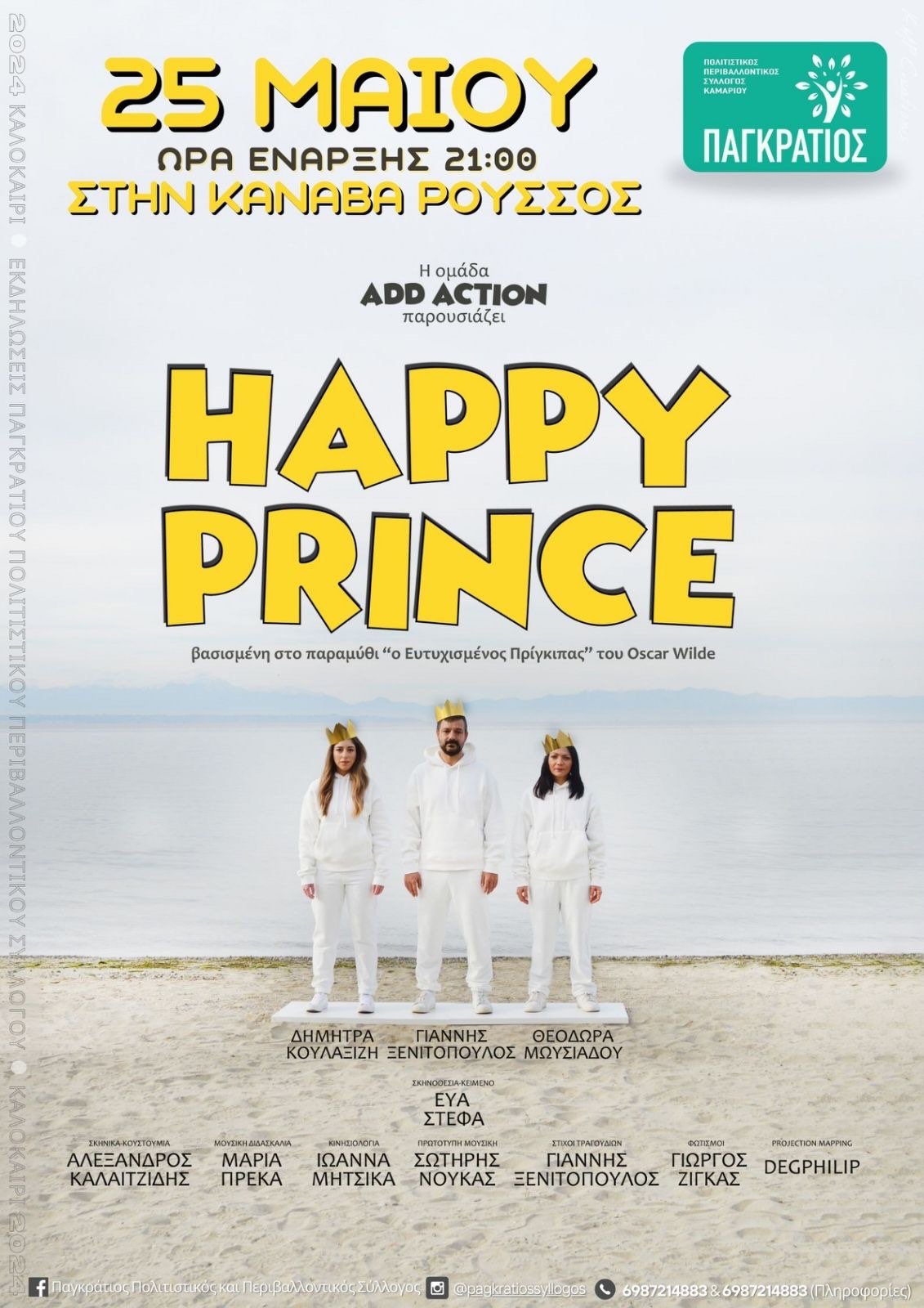 “Ο «Παγκράτιος Περιβαλλοντικός και Πολιτιστικός Σύλλογος Καμαρίου» σας προσκαλεί το Σάββατο 25 Μάϊου 2024 στην Κάναβα Ρούσσος στην Επισκοπή Γωνιά Θήρας με ώρα προσέλευσης 20:30 και ώρα έναρξης 21:00 να παρακολουθήσουμε μαζί την θεατρική παράσταση: Happy Prince βασισμένη στο παραμύθι του Όσκαρ Ουάιλντ, Ο Ευτυχισμένος Πρίγκιπας από την ομάδα Add Action , η οποία αποτελείται από ηθοποιούς και καλλιτέχνες της Θεσσαλονίκης.