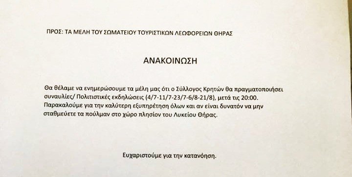 Παρακαλούμε θερμά, στα πλαίσια των δυνατοτήτων σας, να ενημερώσετε τα μέλη σας, τουλάχιστον στις μεγάλες συναυλίες (4/7-11/7-23/7-6/8-21/8), να απομακρύνουν τα λεωφορεία τους έξω από το Λύκειο Θήρας, μετά τις 20:00, ώστε να διευκολυνθούν στην ανεύρεση parking οι επισκέπτες των εκδηλώσεων μας.