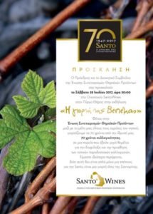 Ο Πρόεδρος και το Διοικητικό Συμβούλιο  της Ένωσης Συνεταιρισμών Θηραϊκών Προϊόντων σας προσκαλούν το Σάββατο 29 Ιουλίου 2017, ώρα 20:00 στο Οινοποιείο SantoWines στον Πύργο Θήρας στην εκδήλωση: