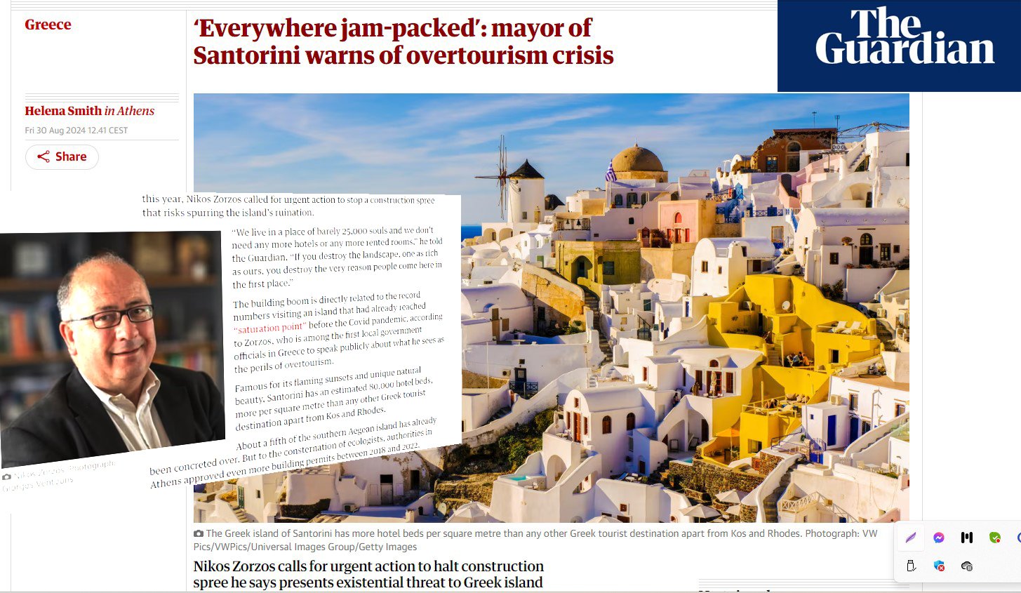 «Η οικοδομική έκρηξη σχετίζεται άμεσα με τους αριθμούς ρεκόρ επισκέψεων σε ένα νησί που είχε ήδη φτάσει σε «σημείο κορεσμού» πριν από την πανδημία του Covid, σύμφωνα με τον Ζώρζο, ο οποίος είναι από τους πρώτους τοπικούς κυβερνητικούς παράγοντες στην Ελλάδα που μίλησε δημόσια για τους κινδύνους που θεωρεί (πως υπάρχουν): του υπερτουρισμού» γράφει η εφημερίδα.