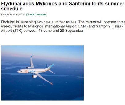 Η Flydubai ξεκινά δύο νέες καλοκαιρινές διαδρομές. Ο αερομεταφορέας θα εκτελεί τρεις εβδομαδιαίες πτήσεις προς το Διεθνές Αεροδρόμιο της Μυκόνου (JMK) και το Αεροδρόμιο της Σαντορίνης (Θήρα) (JTR) μεταξύ 18 Ιουνίου και 29 Σεπτεμβρίου”.