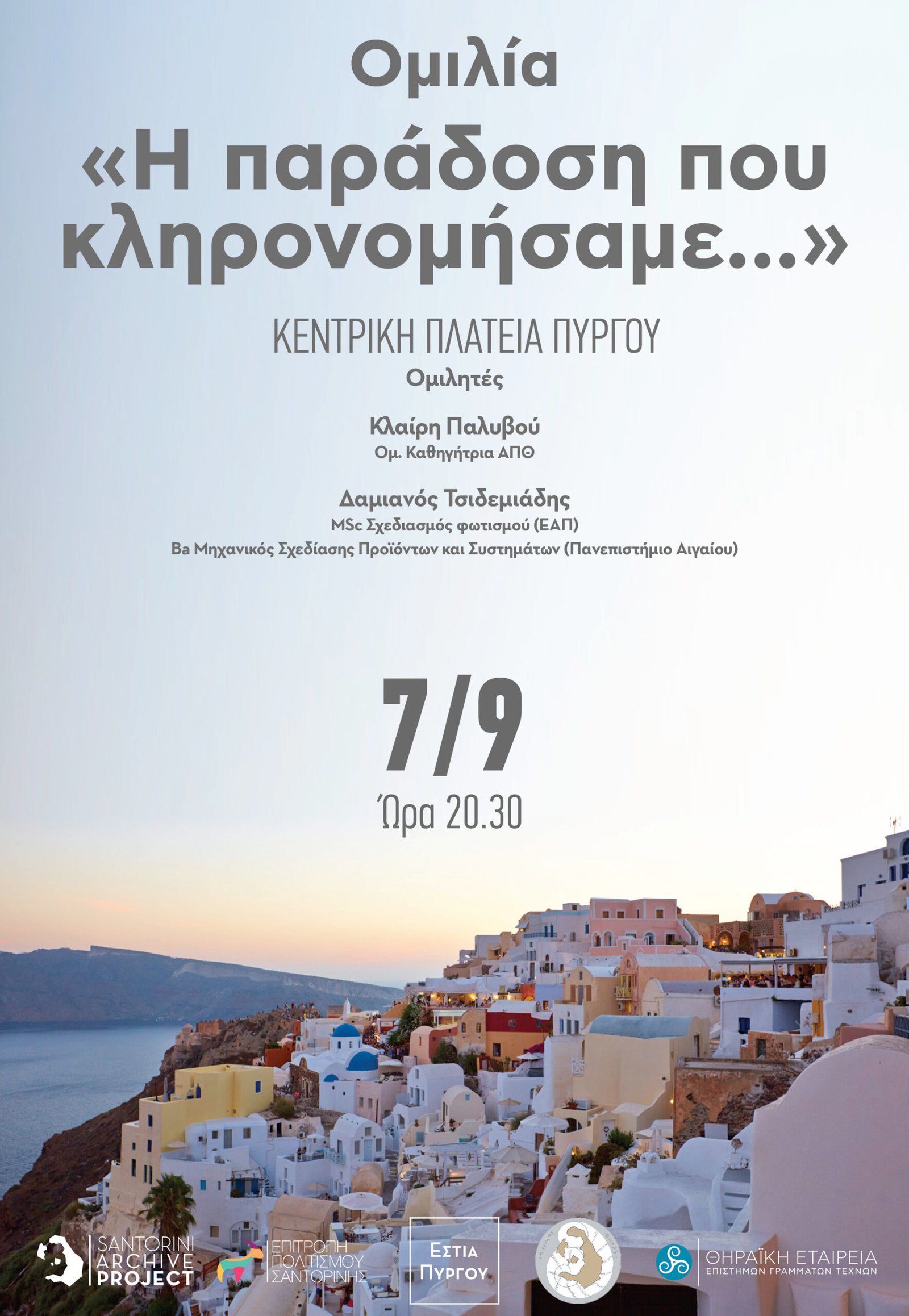 Η Επιτροπή Πολιτισμού του Δήμου Θήρας, η Θηραϊκή Εταιρεία Επιστημών, Γραμμάτων και Τεχνών, η Εστία Πύργου Καλλίστης και το Ψηφιακό Αρχείο Θήρας σας προσκαλούν στην ομιλία της κας Κλαίρης Παλυβού, Ομ. Καθηγήτριας ΑΠΘ και του κ. Δαμιανού Τσιδεμιάδη, MSc Σχεδιασμός φωτισμού (ΕΑΠ), Ba Μηχανικός Σχεδίασης Προϊόντων και Συστημάτων (Πανεπιστήμιο Αιγαίου) με τίτλο «H παράδοση που κληρονομήσαμε…», το Σάββατο 7 Σεπτεμβρίου 2024 και ώρα 20.30 στην πλατεία του Πύργου Καλλίστης.