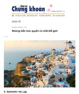 Ανάμεσα σε μοντέρνα και εντυπωσιακά κτίρια όπως το νέο Γερμανικό Κοινοβούλιο, θαυμαστά έργα όπως το Πάρκο Γκουέλ στη Βαρκελώνη που φιλοτέχνησε ο μεγάλος Αντόνιο Γκαουντί και σε συναρπαστικές κατασκευές όπως ο Καθεδρικός της Μπραζίλια, έργο του Oscar Niemeyer, κατατάσεται η Σαντορίνη. Σύμφωνα με δημοσίευμα που πρωτοέκανε την εμφάνισή του στη Βιετναμέζικη οικονομική εφημερίδα chungkhoan, η Σαντορίνη, βρίσκεται στα κορυφαία αρχιτεκτονήματα του κόσμου.