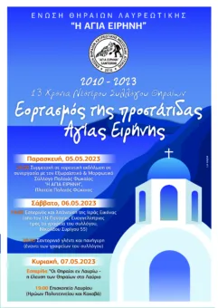 “Η Ένωση Θηραίων Λαυρεωτικής «Αγία Ειρήνη» γιορτάζει 13 χρόνια από τη σύσταση της (2010-2023) και τιμά την προστάτιδα της Αγία Ειρήνη.
