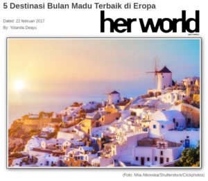 “Μια μικρή πόλη που βρίσκεται στο νησί της Σαντορίνης είναι το ιδανικό μέρος, επειδή έχει ένα πολύ όμορφο τοπίο και μοναδική αρχιτεκτονική”, γράφει το Ινδονησιακό περιοδικό “Her World” σε μικρό αφιέρωμα για τους πέντε καλύτερους γαμήλιους προορισμούς του κόσμου. Αναφέρεται στην Οία, σημειώνοντας: “Επιλέξτε ένα κατάλυμα με πανοραμική θέα στη θάλασσα, έτσι ώστε κάθε πρωί, εσείς και ο σύζυγός σας να ξυπνάτε με τον καταπραϋντικό ήχο των κυμάτων”.