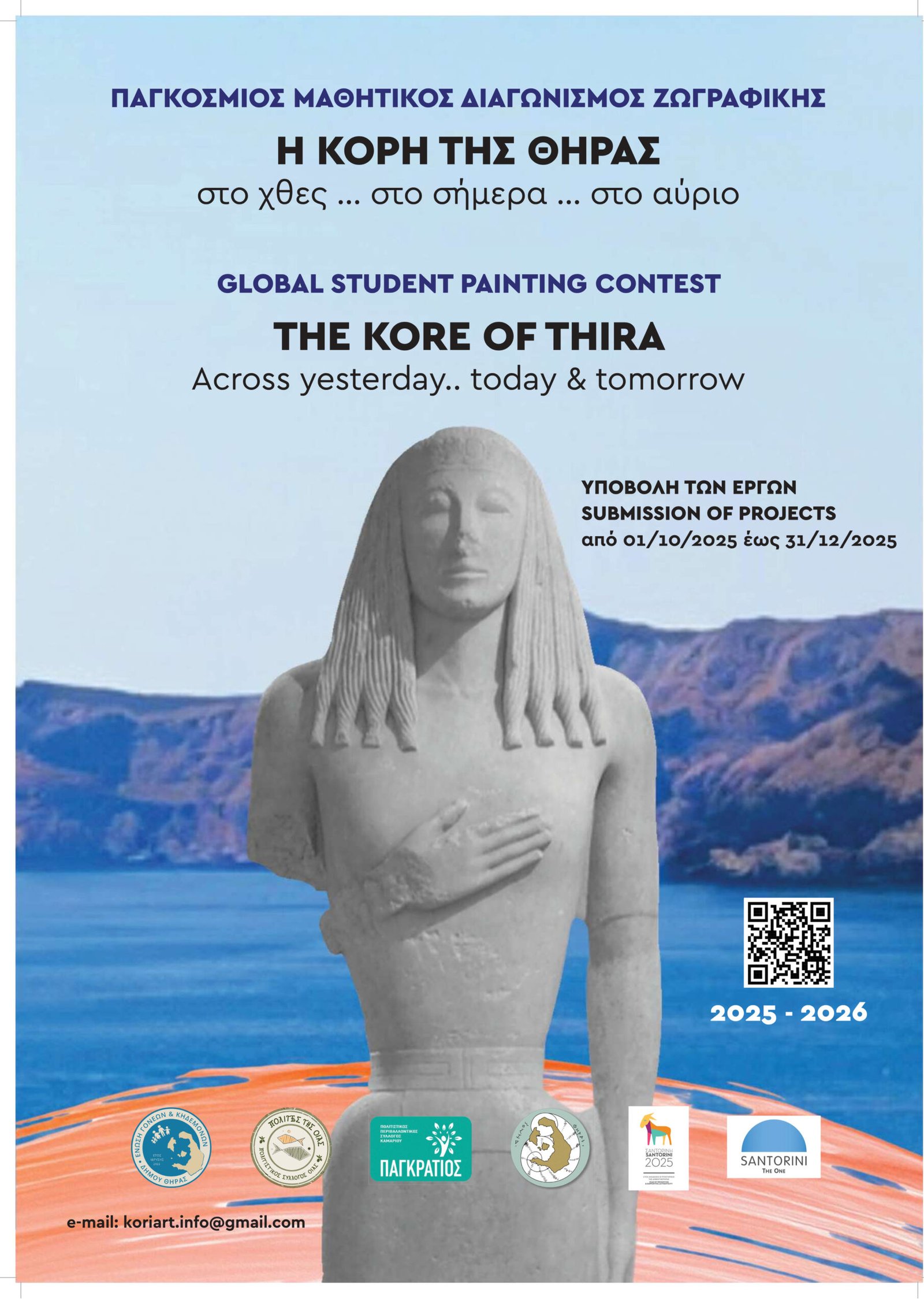 Με σημείο αναφοράς την εμβληματική Κόρη της Θήρας – το άγαλμα που αναδύθηκε από τα ηφαιστειακά χώματα του νησιού και σήμερα φιλοξενείται στο Αρχαιολογικό Μουσείο Θήρας – ο διαγωνισμός καλεί μαθητές από όλο τον κόσμο να δημιουργήσουν έργα εμπνευσμένα από την ιστορία, τον πολιτισμό και την αυθεντικότητα της Σαντορίνης.