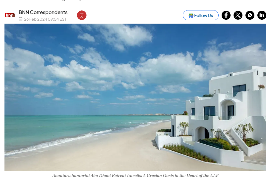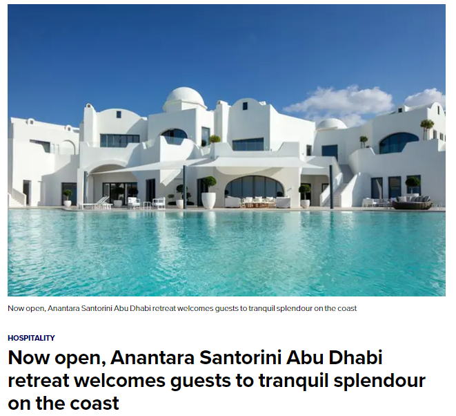 Μπορεί η πραγματική Σαντορίνη, να δυσκολεύεται ελαφρώς στις κρατήσεις σε σχέση με τις προσδοκίες της για υψηλές πληρότητες το 2024, αλλά οι απομιμήσεις της ξεφυτρώνουν σαν τα μανιτάρια σε όλον τον κόσμο. Πρόσφατο κρούσμα, μια Σαντορίνη… αραβίδα, κατά πως θα έλεγε η Λαίδη Άντζελα. Ξεφύτρωσε στο Αμπού Ντάμπι των Ηνωμένων Αραβικών Εμιράτων και όπως αναφέρουν διεθνείς ιστοσελίδες “Το Anantara Santorini Abu Dhabi Retreat, είναι μια γαλήνια όαση μόνο για ενήλικες που βρίσκεται μεταξύ του Άμπου Ντάμπι και του Ντουμπάι, καλωσορίζει τους επισκέπτες με 22 πολυτελή δωμάτια και σουίτες, προσφέροντας ένα μοναδικό μείγμα αιγαιοπελαγίτικης και αραβικής πολυτέλειας στην ακτή των ΗΑΕ”.