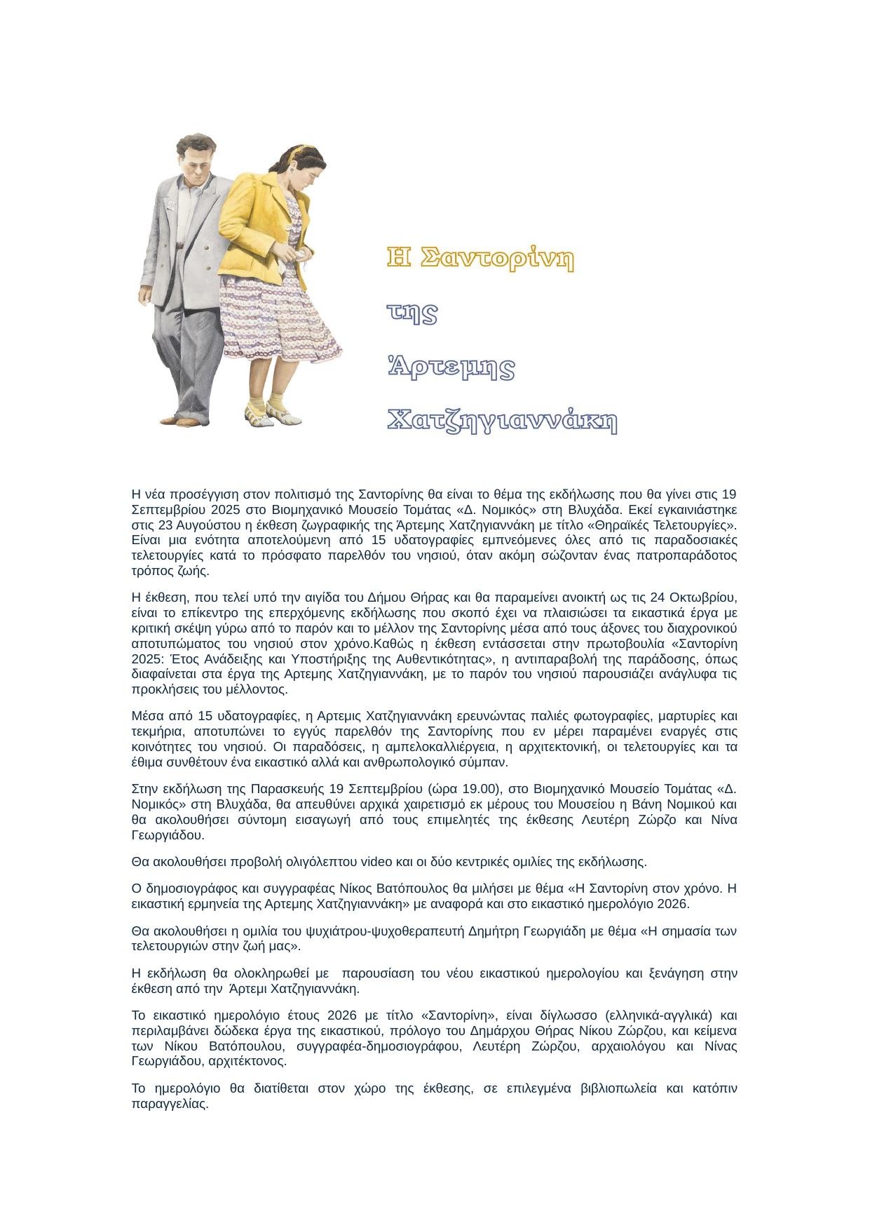 Η εκδήλωση θα ολοκληρωθεί με την παρουσίαση του νέου εικαστικού ημερολογίου έτους 2026 με τίτλο «Σαντορίνη», καθώς και με ξενάγηση στην έκθεση από την ίδια την Άρτεμη Χατζηγιαννάκη.