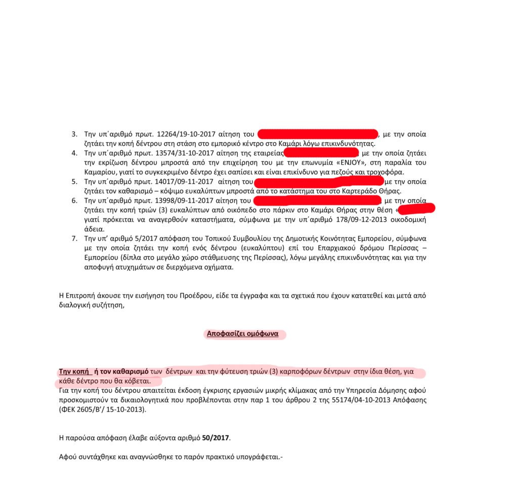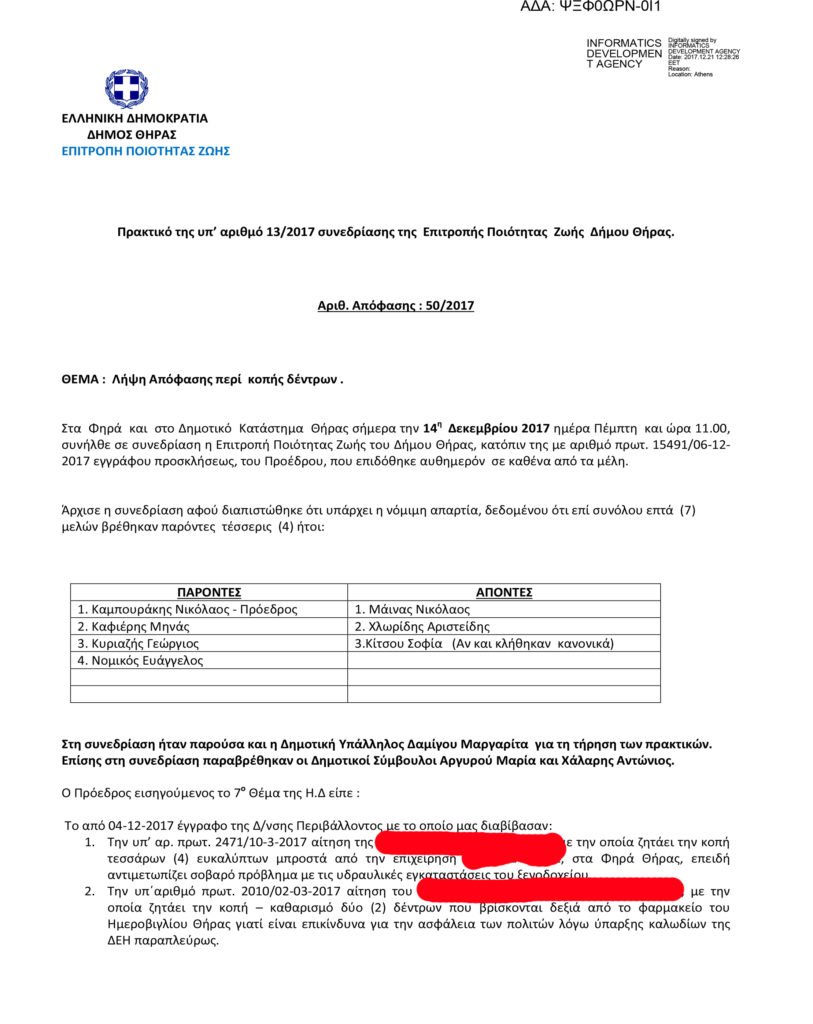 Στις 14 Δεκεμβρίου 2017 ημέρα Πέμπτη και ώρα 11.00, συνήλθε σε συνεδρίαση η Επιτροπή Ποιότητας Ζωής του Δήμου Θήρας. Εξέτασε, αιτήματα δημοτών. Αίτημα;. Μαζική σφαγή ευκαλύπτων. Το έγγραφο της συνεδρίασης επισυνάπτεται, για να αναδειχθεί το σκεπτικό. Ενοχλούν. Ενοχλούν. Ενοχλούν. Αυτό είναι το σκεπτικό. Για κάθε σφαγιασθένα ευκάλυπτο όμως επιβάλλεται να φυτευτούν τρία οπωροφόρα δέντρα. Έτσι, κουτουρού. Μπορεί δηλαδή να είναι μια γλάστρα με πιπεριές τουρκάκια. Ένα μίνι κουμ-κουάτ. Μια μηλιά μπονζάι, μια κακότυχη νεραντζιά ή ένα κατσούνι. Με τη σφραγίδα της Επιτροπής Ποιότητας Ζωής του Δήμου Θήρας. Που ουδέποτε-λόγω της χιλιοτραγουδισμένης υποστελέχωσης, φυσικά- θα ελέγξει αν τηρήθηκαν τα υπεσχημένα.