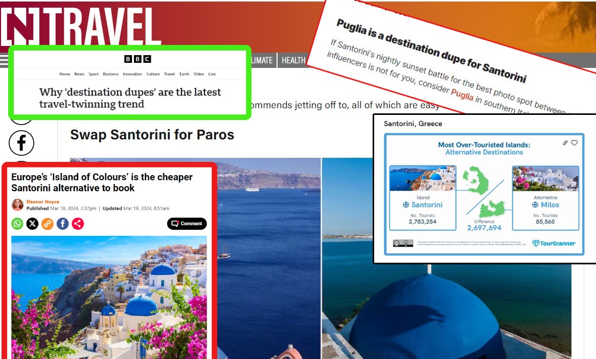 Αρκεί λοιπόν, να βρεθούν οι κατάλληλες βιοτεχνίες που να παράγουν τις καλύτερες απομιμήσεις. Και για τη Σαντορίνη, υποψήφιες είναι αρκετές. Και το χειρότερο είναι, πως ως βιοτεχνίες μπορούν να σταθούν αξιοπρεπώς με τη δική τους επωνυμία και να δημιουργήσουν τη δική τους αγοραστική άλω. “Μπείτε σε μια από τις μεγαλύτερες ταξιδιωτικές τάσεις του 2024”, γράφουν πολλά ξένα μέσα ενημέρωσης, με τα βρετανικά να παίρνουν την πρωτοκαθεδρία, τα ινδικά να έπονται και την Αμερική να ακολουθεί. “Οι ταξιδιώτες απομακρύνονται από δημοφιλείς προορισμούς και προτιμούν πιο φιλικές προς τον προϋπολογισμό τους επιλογές που προσφέρουν παρόμοια ατμόσφαιρα με τον πιο ακριβό προορισμό. Λίβερπουλ για Λονδίνο , Πάρος για Σαντορίνη και Κουρασάο για St Martin” γράφει -ενδεικτικά- το BBC. “Η Απουλία είναι ένας προορισμός για τη Σαντορίνη”, γράφει το Euronews και προσθέτει: “Αν η νυχτερινή μάχη για το καλύτερο φωτογραφικό σημείο για το ηλιοβασίλεμα της Σαντορίνης μεταξύ των influencers που κρατούν selfie-stick δεν είναι για εσάς, σκεφτείτε την Απουλία στη νότια Ιταλία”.