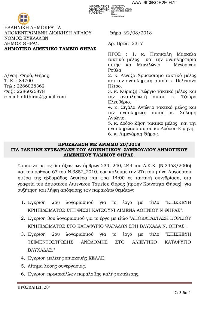 - ΠΡΟΣΚΛΗΣΗ ΜΕ ΑΡΙΘΜΟ 20/2018 ΓΙΑ ΤΑΚΤΙΚΗ ΣΥΝΕΔΡΙΑΣΗ ΤΟΥ ΔΙΟΙΚΗΤΙΚΟΥ ΣΥΜΒΟΥΛΙΟΥ ΔΗΜΟΤΙΚΟΥ ΛΙΜΕΝΙΚΟΥ ΤΑΜΕΙΟΥ ΘΗΡΑΣ. Σύμφωνα με τις διατάξεις των άρθρων 239, 240, 244 του Δ.Κ.Κ. (Ν.3463/2006) και του άρθρου 67 του Ν.3852_2010, σας καλούμε την 27η του μήνα Αυγούστου ημέρα της εβδομάδος Δευτέρα και ώρα 14:00 σε τακτική συνεδρίαση, στα γραφεία του Δημοτικού Λιμενικού Ταμείου Θήρας (πρώην Κοινότητα Θήρας) για συζήτηση και λήψη απόφασης των παρακάτω θεμάτων: