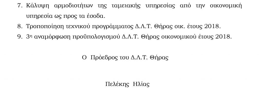 - 8. Τροποποίηση τεχνικού προγράμματος Δ.Λ.Τ. Θήρας οικ. έτους 2018. 9. 3η αναμόρφωση προϋπολογισμού Δ.Λ.Τ. Θήρας οικονομικού έτους 2018.Ο Πρόεδρος του Δ.Λ.Τ. Θήρας Πελέκης Ηλίας