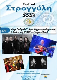 Η «αυλαία» του «7ου Φεστιβάλ Στογγύλη» θα πέσει με τρόπο… εκκωφαντικό στον Προαύλιο Χώρο του Κλειστού Γυμναστηρίου του Δήμου Θήρας, την Παρασκευή 6 Σεπτεμβρίου 2024 στις 21:00, όπου τη σκηνή θα μοιραστούν οι Magic De Spell, ο Χριστόφορος Κροκίδης, οι Απροσάρμοστοι και ο Δημήτρης Καλαντζής.