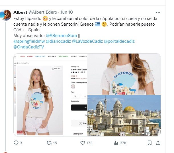 “Είναι μάλλον δυσάρεστα δύσκολο να κάνεις συγκρίσεις” γράφει η Αναδαλουσιανή εφημερίδα “Sur” στην αγγλόφωνη έκδοσή της. Ωστόσο, ένα από τα τελευταία σχέδια μπλουζών του Σπρίνγκφιλντ που απεικονίζει την κύρια πόλη του νησιού της Σαντορίνης στην Ελλάδα έχει πυροδοτήσει διαμάχη στα social media: “Τι εννοείς Σαντορίνη, Ελλάδα; Αυτός είναι ο καθεδρικός ναός του Κάδιθ.” , προσθέτει.