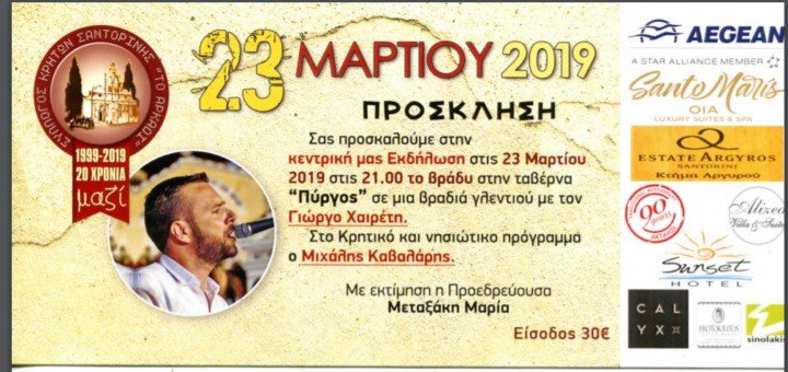 ΚΕΝΤΡΙΚΗ ΕΚΔΗΛΩΣΗ ΤΟΥ ΣΥΛΛΟΓΟΥ ΚΡΗΤΩΝ ΣΑΝΤΟΡΙΝ ΗΣ