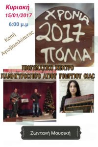 “Σας προσκαλούμε στην ετήσια κοπή της Αγιοβασιλιάτικης πίτας της Ενορίας μας που θα πραγματοποιηθεί στο Πνευματικό Κέντρο του Αγίου Γεωργίου Οίας “Πανηγυρόσπιτο” την Κυριακή 15 Ιανουαρίου 2017 και ώρα 6:00μ.μ.