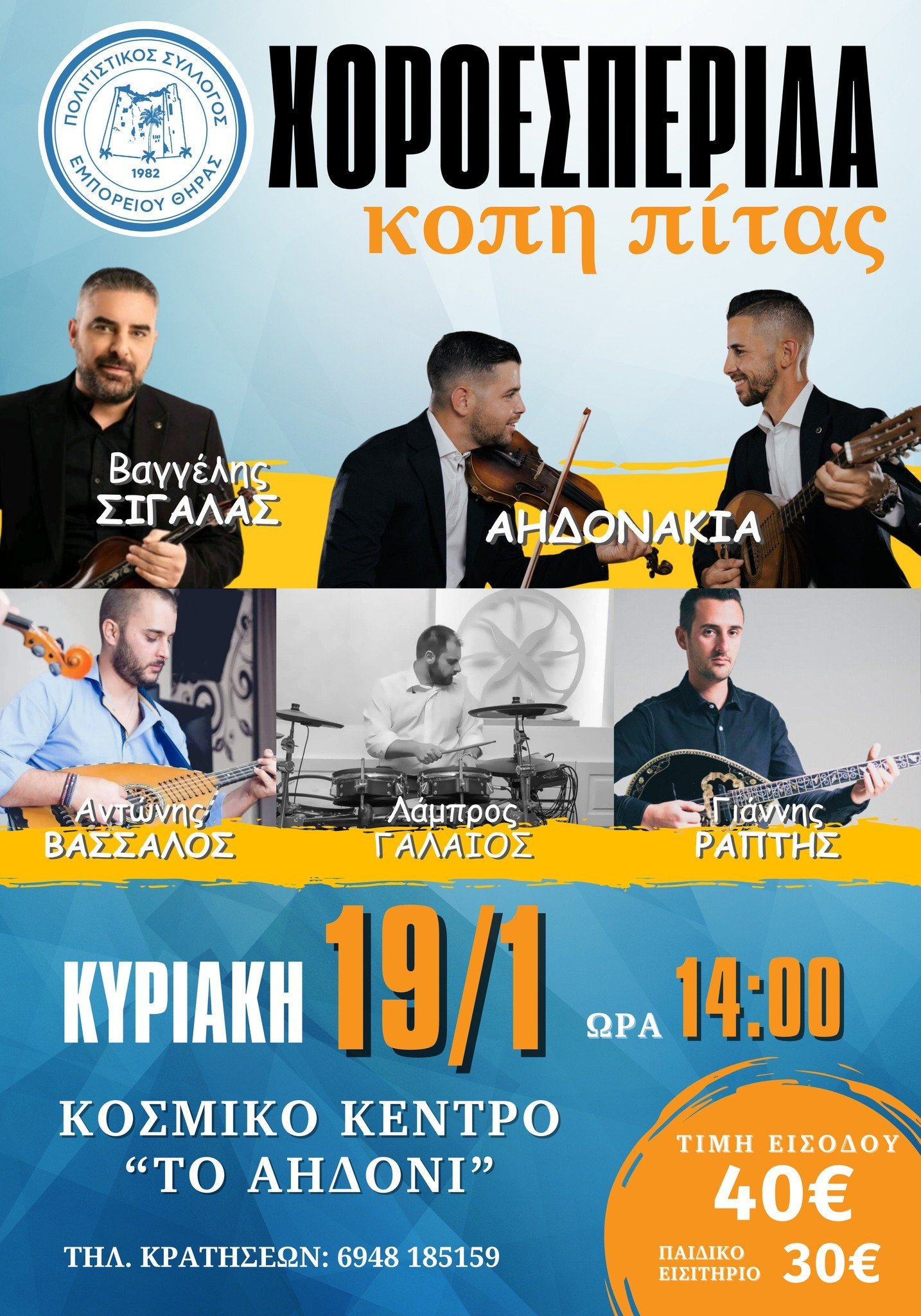 “Ο Πολιτιστικός Σύλλογος Εμπορείου Θήρας σας προσκαλεί την Κυριακή 19 Ιανουαρίου 2025 και ώρα 14:00 στην κοπή της πρωτοχρονιάτικης πίτας μας στο κοσμικό κέντρο “Το Αηδόνι”.