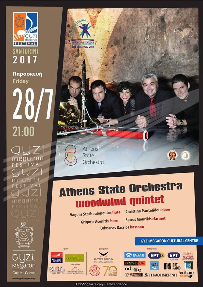 Παρασκευή 28 Ιουλίου 2017, ώρα 21.00, το Κουϊντέτο ξύλινων πνευστών Κρατικής Ορχήστρας Αθηνών, αναδεικνύει την αμφίδρομη σχέση της μουσικής με το θέατρο, την όπερα, το μπαλέτο, το χορό και τον κινηματογράφο (Πνευματικό Κέντρο Μέγαρο Γκύζη). Είσοδος ελεύθερη.