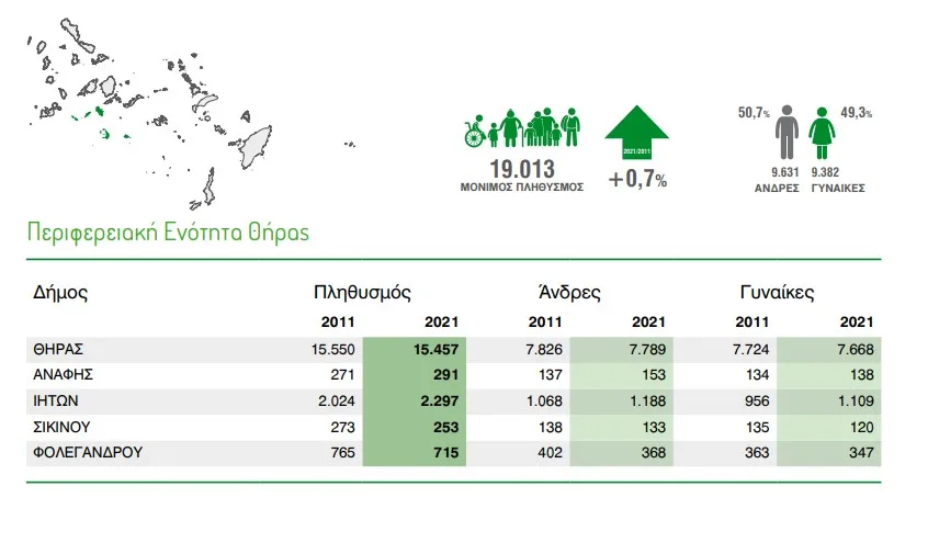 Σύμφωνα με την απογραφή, η Περιφερειακή Ενότητα Θήρας, παρουσιάζει αύξηση 0.7% συγκριτικά με τον αντίστοιχο πληθυσμό του 2011. Όμως ο Δήμος Θήρας, εμφάνισε μικρή μείωση καθώς απογράφηκαν 93 λιγότεροι από το 2011. Η μικρή άνοδος στην Π.Ε. οφείλεται στην Ίο και την Ανάφη, καθώς Σίκινος. Φολέγανδρος παρουσίασαν μικρή μείωση.