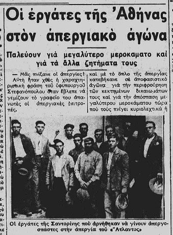 Τότε έγινε μια μεγάλη απεργία και ο Ριζοσπάστης εκείνης της εποχής διαλέγει μια φωτογραφία με Σαντορινιούς εργάτες, που αρνούνταν την εξαντλητική και πενιχρά αμειβόμενη δουλειά. Και παρά την πείνα, δεν έγιναν απεργοσπάστες.